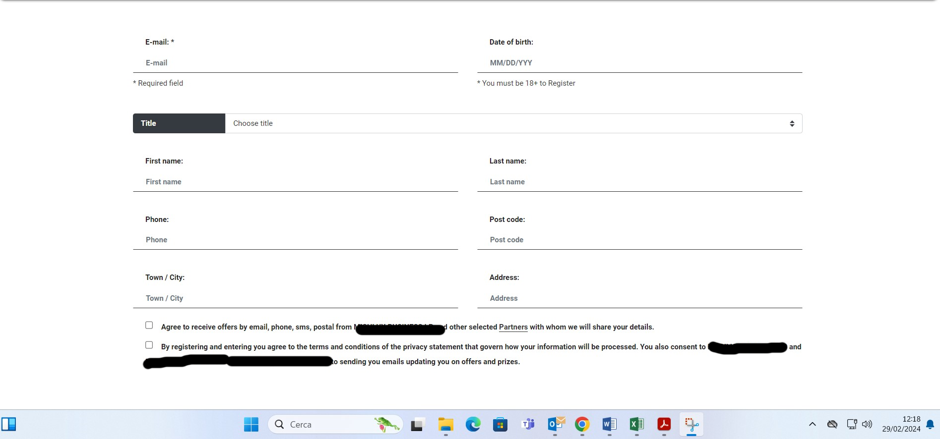 1) con riferimento ai siti internet riconducibili alla società XX, con sede in Irlanda, è emersa l’acquisizione di un unico consenso per le distinte finalità di marketing del titolare e di comunicazione a terzi per loro attività promozionali (cit. “Agree to receive offers by email, phone, sms, postal from XX and other selected Partners with whom we will share your details” - sito internet XX); inoltre, è emerso che la registrazione al sito avrebbe comportato l’invio di e-mail promozionali da parte del titolare (cit. “By registering and entering you agree to the terms and conditions of the privacy statement that govern how your information will be processed. You also consent to XX, XX, to sending you emails updating you on offers and prizes” - sito internet XX) (v. figura di seguito).