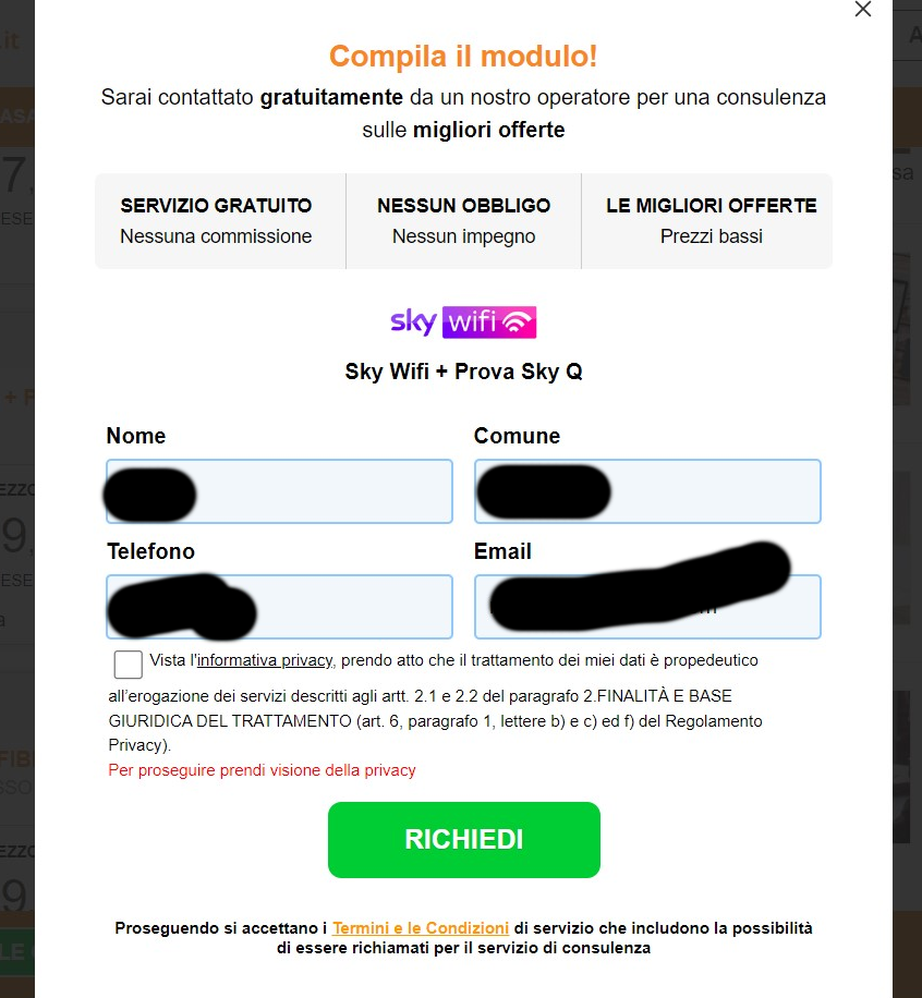 Con riferimento, invece, ai riscontri documentali inerenti alle 9 utenze acquisite mediante il portale del comparatore XX, da una verifica svolta dell’Ufficio accedendo al relativo sito internet www... (di titolarità del medesimo), è emerso che per finalizzare la registrazione al form on-line per ottenere una consulenza sulle migliori offerte Sky, viene richiesto di autorizzare il trattamento dei dati personali “propedeutico all’erogazione dei servizi descritti agli artt. 2.1. e 2.2.” dell’informativa privacy e per i quali sono richiamate le distinte basi giuridiche riconducibili al contratto, di cui all’art. 6, par. 1, lett. b) del Regolamento, e al legittimo interesse disciplinato dalla lett. f) del medesimo articolo.