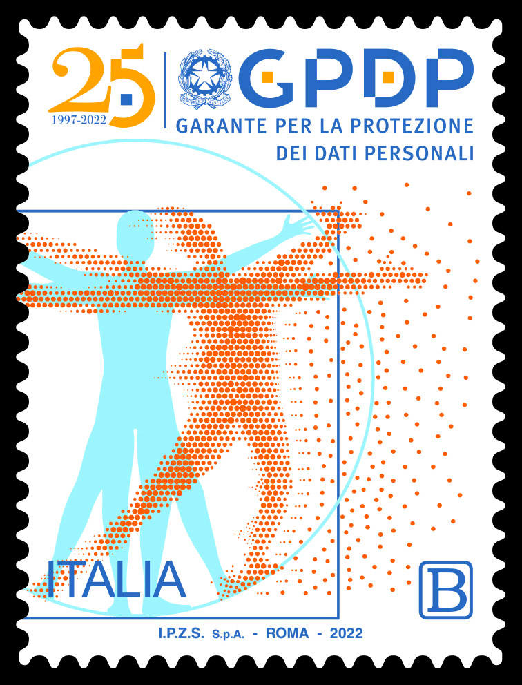 La stilizzazione grafica dell’uomo vitruviano di Leonardo che idealmente si trasforma in dati digitali è l’immagine raffigurata sul francobollo che celebra i 25 anni dell’introduzione nel nostro Paese della normativa sulla privacy e dell’istituzione del Garante per la protezione dei dati personali, entrato in funzione l’8 maggio 1997.