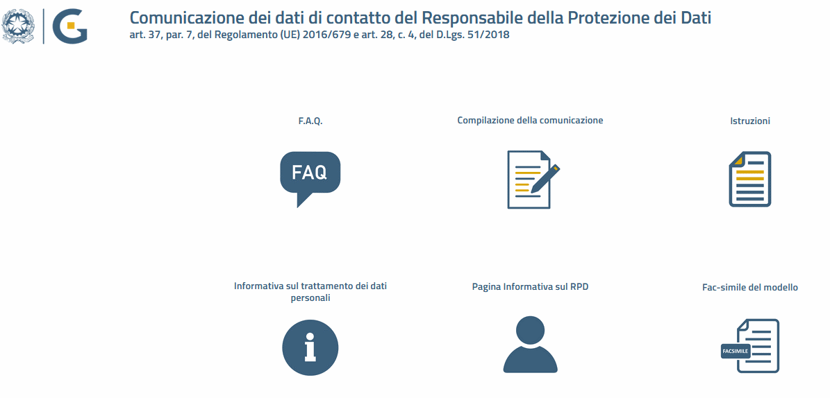 ATTENZIONE: Tale procedura è l’unica che può essere utilizzabile per l’invio, la variazione e la revoca dei dati di contatto del Responsabile della protezione dei dati e non potranno essere prese in considerazione le comunicazioni effettuate attraverso diversi canali di contatto con il Garante (es. e-mail, posta, ecc.). Attraverso la procedura indicata non è consentito presentare quesiti, richieste e istanze al Garante, in quanto predisposta unicamente per la ricezione delle informazioni relative al Responsabile per la protezione dei dati. Per le altre istanze, si prega di utilizzare i moduli specificatamente messi a disposizione sul sito.