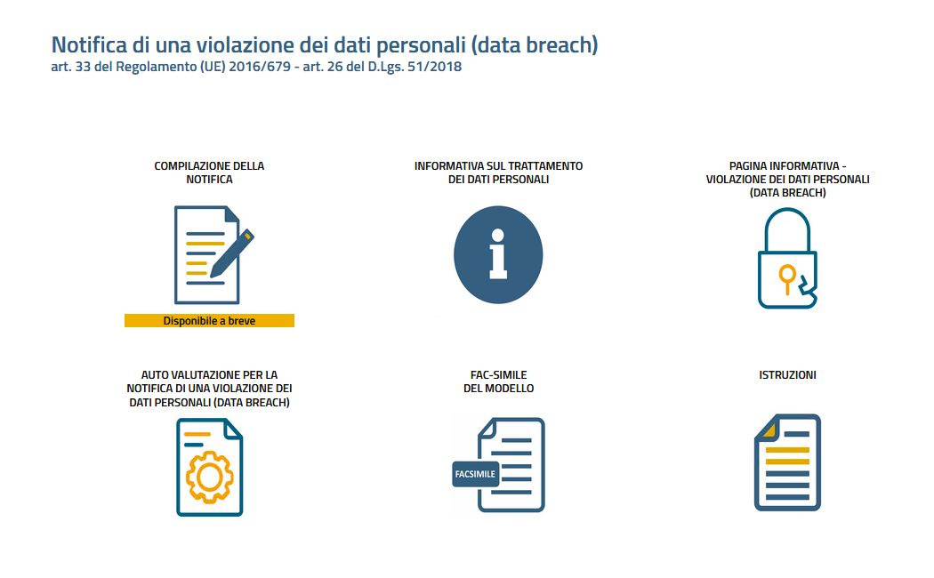 A partire dal 1° luglio 2021, la notifica di una violazione di dati personali deve essere inviata al Garante tramite un’apposita procedura telematica, resa disponibile nel portale dei servizi online dell’Autorità, e raggiungibile  all’indirizzo https://servizi.gpdp.it/databreach/s/ (VEDI: Provvedimento del 27 maggio 2021).