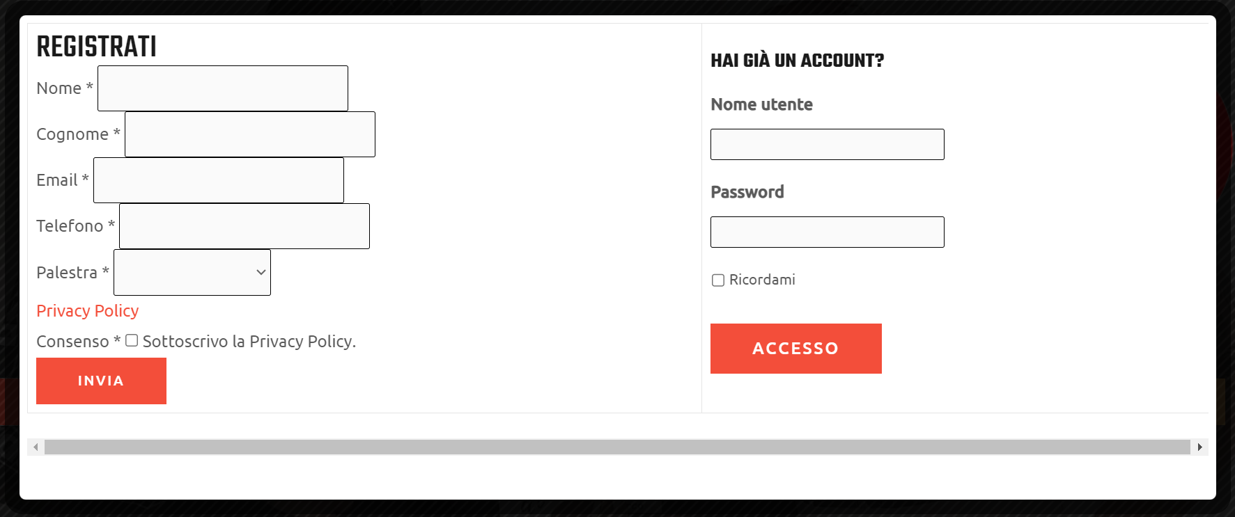 Come si vede dal contenuto del form, veniva richiesto all'utente di registrarsi per avere informazioni sui contenuti indicati nei pulsanti ("palestre", "servizi" e "chi siamo"). Veniva richiesto di indicare obbligatoriamente nome, cognome, email e telefono e veniva richiesto obbligatoriamente di "sottoscrivere" la privacy policy. Quest'ultima tuttavia non risultava in alcun modo raggiungibile, perché il link in rosso "Privacy Policy" rimandava all'home page e lo stesso avveniva cliccando sul link "Privacy & Cookies Policy" presente in home page. In mancanza di detta informativa, non era possibile comprendere per quali finalità venissero raccolti questi dati, con quali modalità e da chi sarebbero stati trattati, né come fosse possibile esercitare i propri diritti. Peraltro, non si comprendeva neanche quale utilità avrebbe dovuto trarre un utente da tale registrazione visto che, per avere informazioni su "palestre", "servizi" e "chi siamo", non dovrebbe - di norma - essere necessario rilasciare alcun dato personale, né tantomeno registrarsi a un servizio. È risultato inoltre confermato che non era presente alcun campo per la richiesta di consenso alla ricezione di messaggi promozionali ad eccezione del campo "consenso" posto in calce e contrassegnato come obbligatorio, che però faceva riferimento a "Sottoscrivo la Privacy Policy".